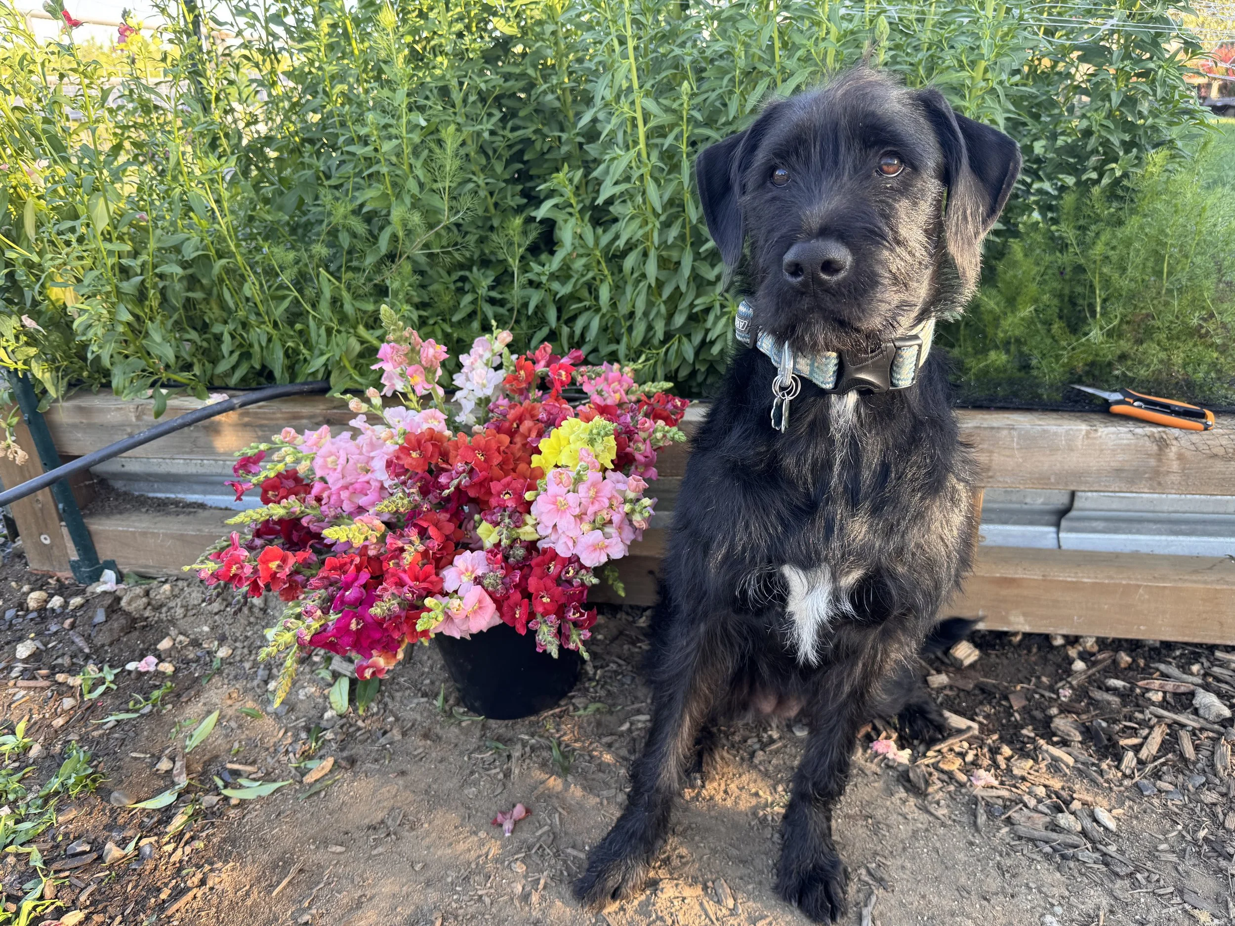 Theo is the farm pup. She is always ready to play or go for a walk to check up on the flowers.